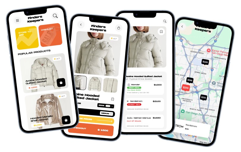 Finders Keepers is a mobile app that reframes bargain-hunting as a treasure hunt. It surfaces the best deals nearby in real time, shows a visual savings breakdown, and uses flash-sale mechanics to give shoppers a sense of play without the decision fatigue.