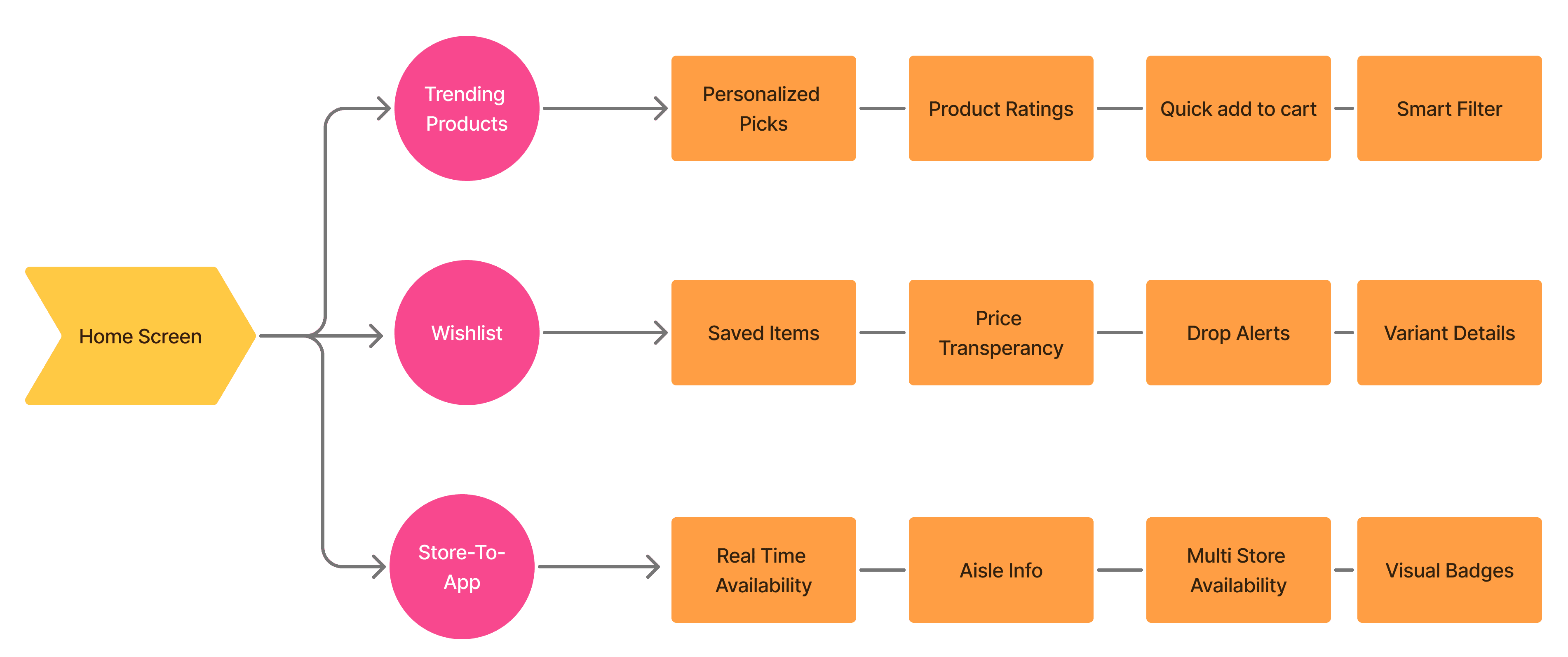 I started on paper, then moved to low-fi digital to pressure-test the flow. The whole app collapses into four "moments" a shopper actually has: I want to browse. I want to find something specific. I want to see what's nearby. I want to check out.